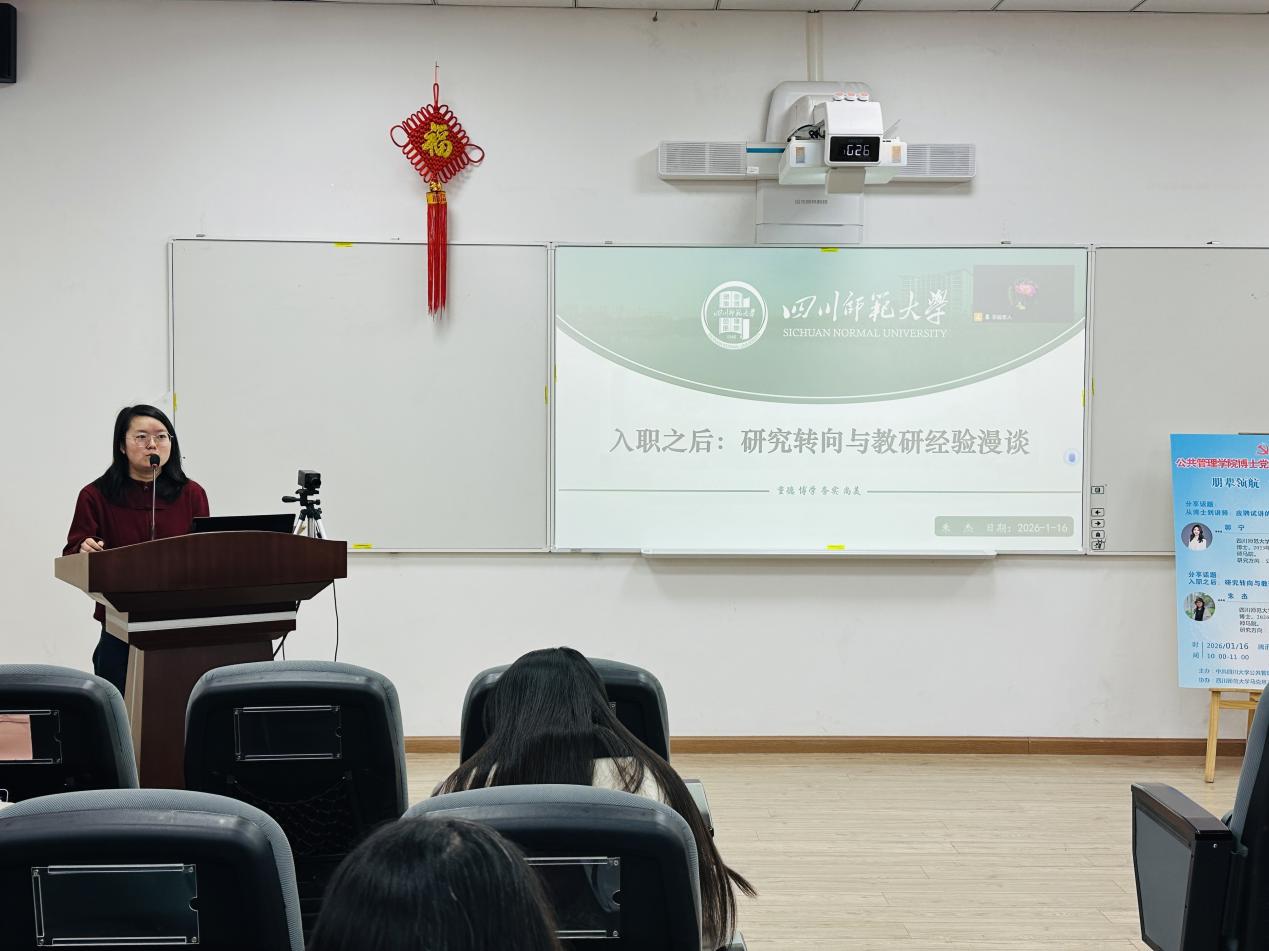 为强化党建赋能、助力博士就业,公共管理学院博士生第一、第二党支部于2026年1月16日共同举办了第八期“朋辈领航,博采众长”主题党日活动。本次活动特邀四川师范大学马克思主义学院郭宁、朱杰两位老师分享了求职及工作的经验。会议由李岚老师主持,70余名博士生党员通过线上线下联动参会。