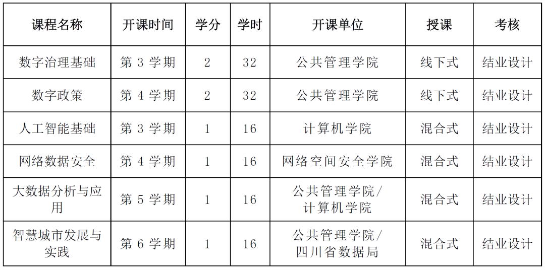 课程包括《数字治理基础》《数字政策》《人工智能基础》《网络数据安全》《大数据分析与应用》《智慧城市发展与实践》。