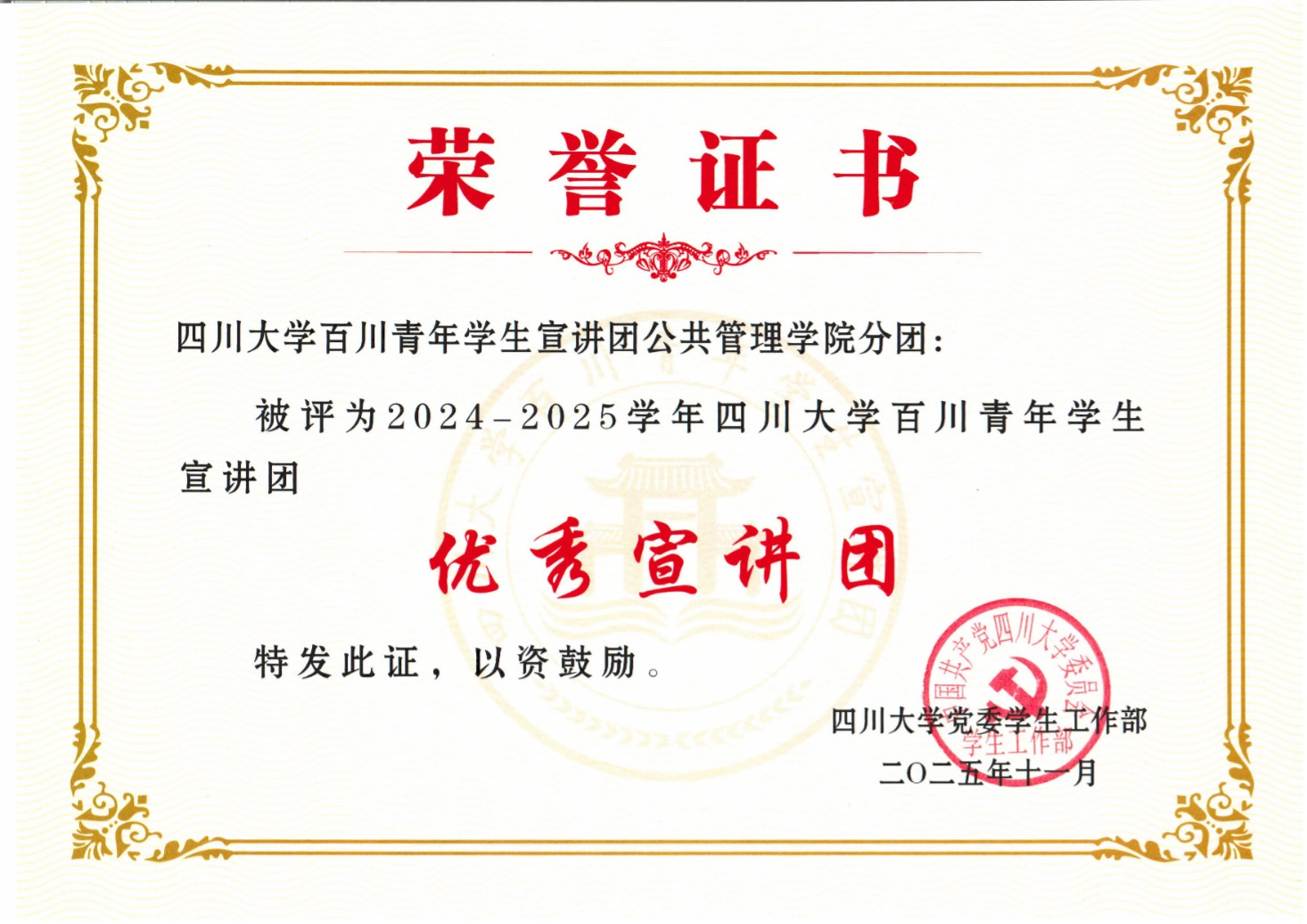 2025年11月28日下午,四川大学百川青年学生宣讲团上学年总结表彰大会在望江校区圆满举行。公共管理学院分团师生表现优异,共斩获四项集体与个人荣誉,充分展现了我院学子出色的理论素养与青春担当!