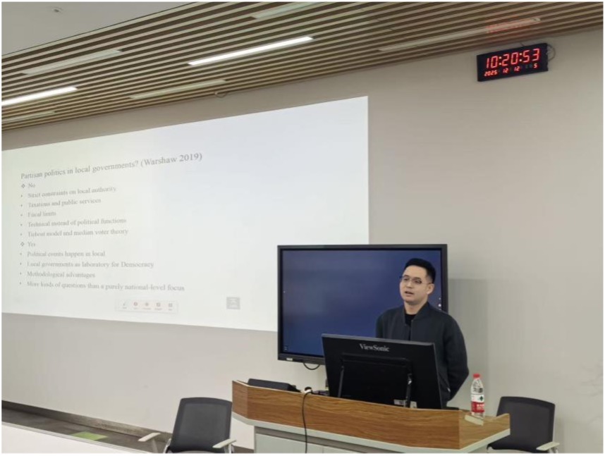 12月12日上午,清华大学公共管理学院魏文池副教授应邀做客我院第25期“格致讲坛”,作题为“Partisan Politics in Budget Making: Two Quasi-Experiments”(预算制定中的党派政治:两项准实验研究)的学术讲座。讲座聚焦公共管理领域前沿议题,吸引了全院师生积极参与,现场学术氛围浓厚。