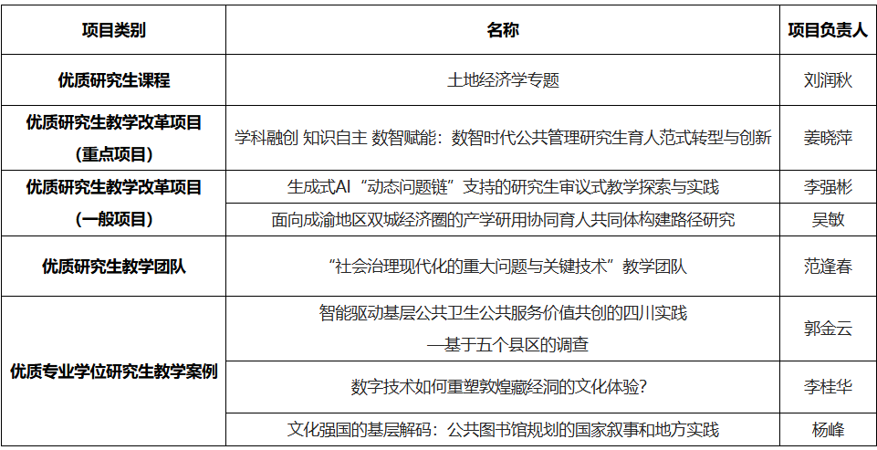 近日,四川省教育厅公布了《2025年四川省研究生优质教育教学资源建设项目认定名单》,我院8个项目入选2025年四川省研究生优质教育教学资源建设名单,涵盖研究生课程、研究生教学改革项目、研究生教学团队及专业学位研究生教学案例等多个类别。