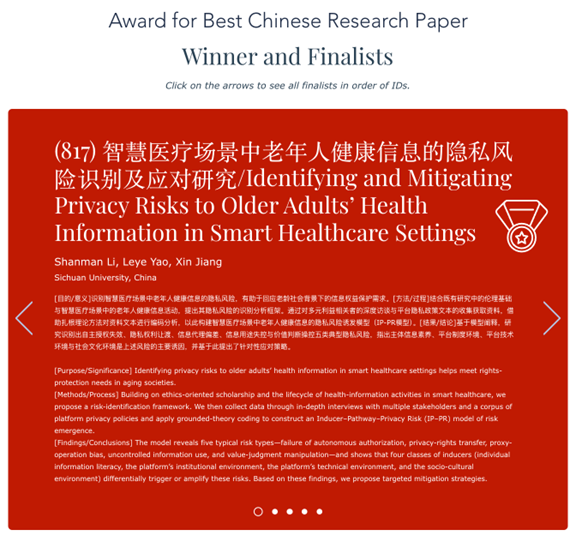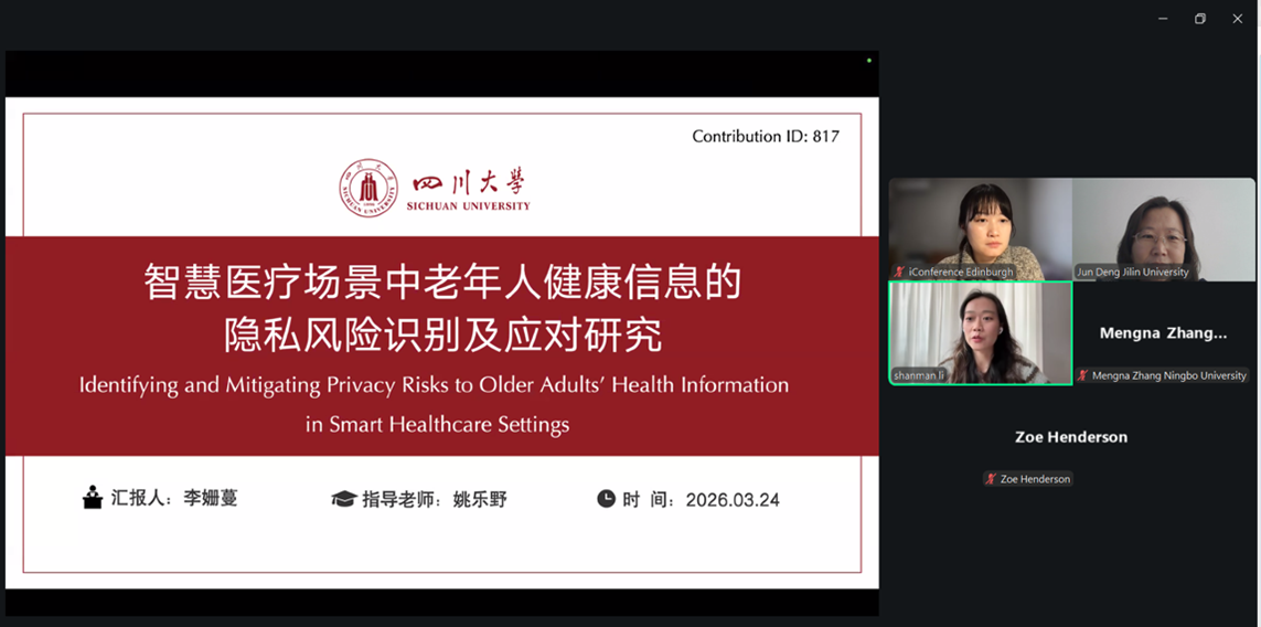 3月23日,信息资源管理领域国际顶级学术会议iConference 2026公布本年度最佳论文与最佳海报奖获奖名单。在姚乐野教授指导下,我院博士研究生李姗蔓与蒋欣合作完成的论文《智慧医疗场景中老年人健康信息的隐私风险识别及应对研究 / Identifying and Mitigating Privacy Risks to Older Adults’Health Information in Smart Healthcare Settings》荣获最佳中文论文奖(Best Chinese Research Paper Award),为该类别唯一最佳奖项。