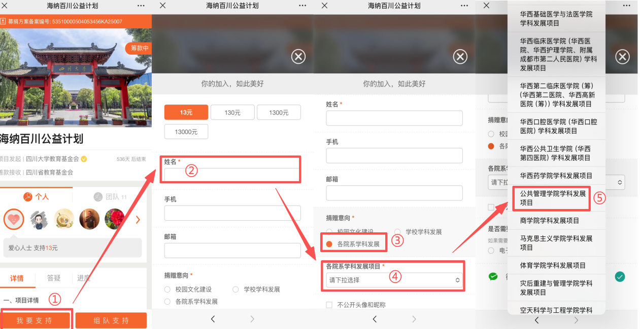 支持学院学科发展可扫码参与四川大学“海纳百川公益计划”,点击“我要支持”,选择“各院系学科发展”,点击下拉菜单,选择“公共管理学院学科发展项目”,可填写或选择130元、1300元等具纪念意义的金额,也可自定心意金额。具体流程如下: