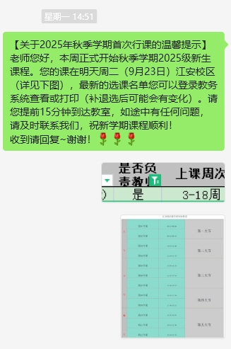 亮点二:本科教务办妥当安排,切实保障教学工作顺利进行。学院本科教务办公室教务管理人员提前做好一周工作安排,确实保证了第一周所涉及课程开展教学工作。落实院领导、办公室教务人员等每一位检查人员的检查时段、检查课程,并提前一天再次提醒检查人员,将需检查的课程清单通过微信发给检查人员。提前一天通知每一位教师注意课程时间、教室及其他准备事项,切实保障了开学各项教学工作稳步进行。
